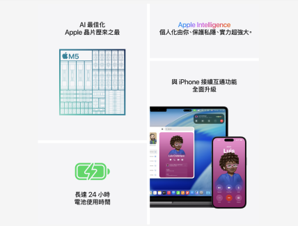 1Testing conducted by Apple in September 2025 using preproduction 14-inch MacBook Pro systems with Apple M5, 10-core CPU, 10-core GPU, 24GB of unified memory, and 1TB SSD. Wireless web battery life tested by browsing 25 popular websites while connected to Wi-Fi. Video streaming battery life tested with 1080p content in Safari while connected to Wi-Fi. Display brightness set to 8 clicks from the bottom and keyboard backlight was off. Battery life varies by use and configuration. See apple.com/hk/en/batteries for more information.