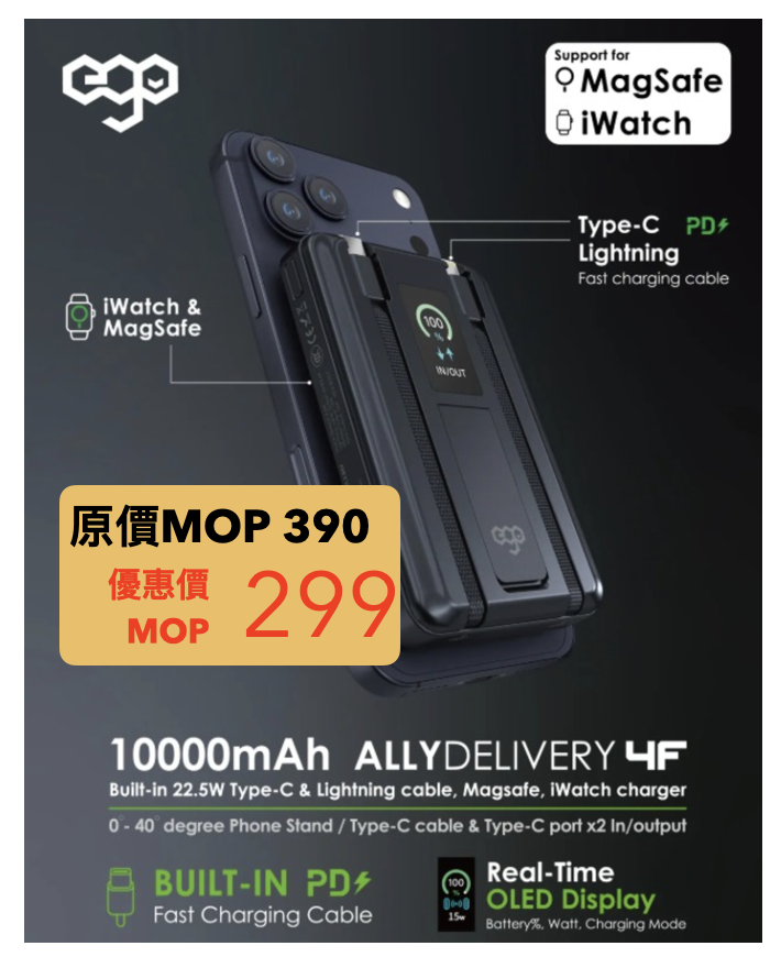 EGO AllyDelivery 4F 3C認證版 Magsafe 6in1 自帶線移動電源 10000mAh AD4F