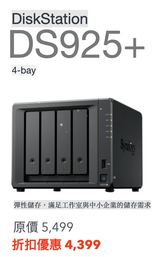 (AMD Ryzen V1500B Quad Core 2.2 GHz, 4GB DDR4 RAM ( Expanable up to 32GB ), 2 x 2.5GbE, 2 x USB 3.1) 最大支援容量:180TB 可裝置硬碟數量:4 硬碟介面:3.5/2.5吋 SATA, M.2 2280 NVMe SSD 外部連接埠:RJ-45 USB 裝置支援:USB Type-C, USB 3.2 Gen 1