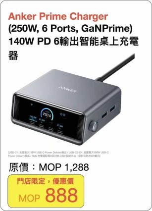 (USB-C1: 支援最大140W USB-C Power Delivery輸出 / USB-C2-C4: 支援最大100W USB-C Power Delivery輸出 / GaN 充電器配備4個USB-C及2個USB-A,提供合計250W輸出) 類型:桌上型充電器 USB插位數目:2 Type-C插位數目:4 快充技術:PD 最大輸出功率:250W