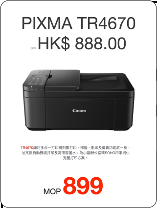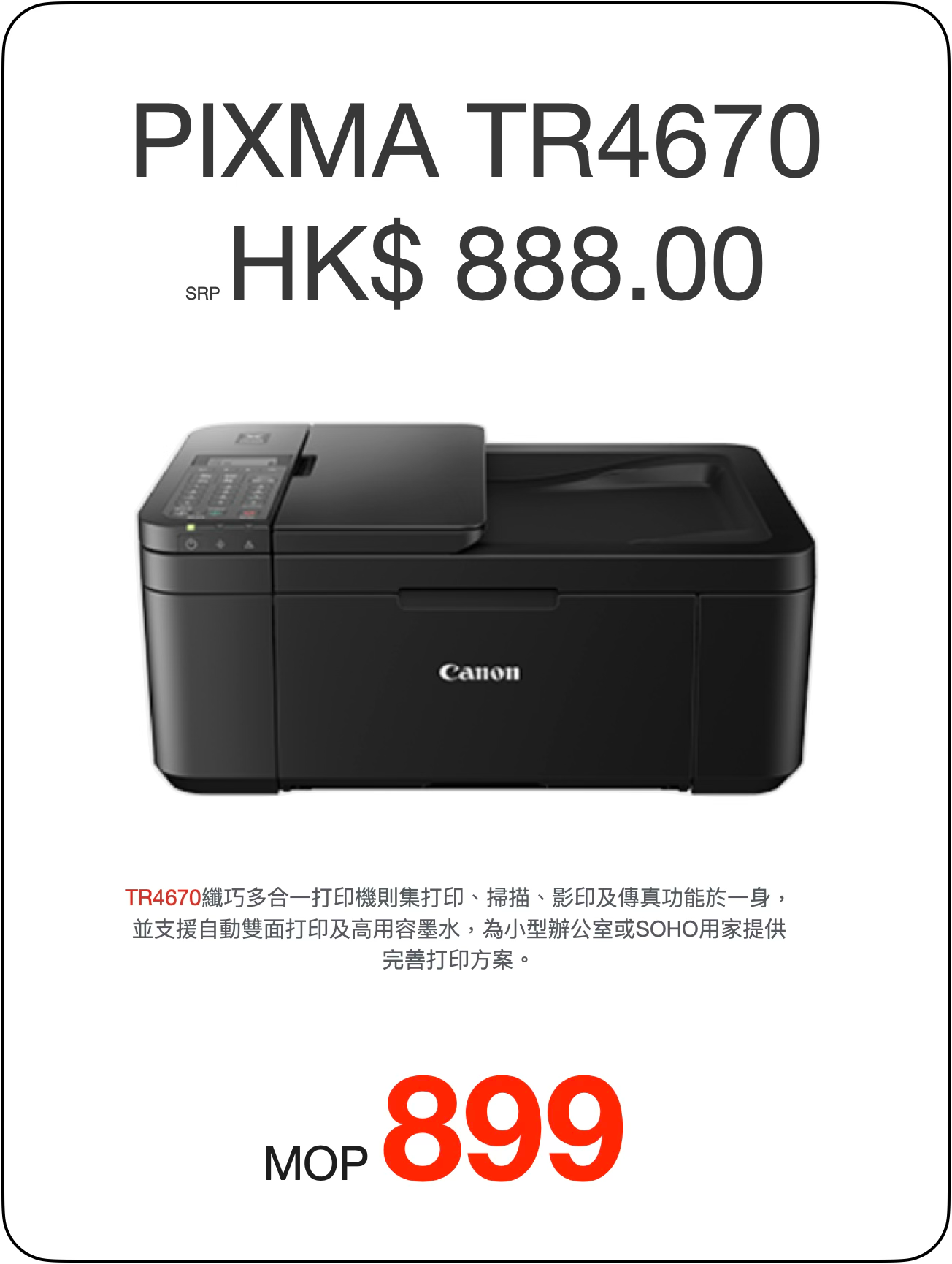 PIXMA TR4670 纖巧多合一打印機,盒型慳位設計,集彩色打印、掃描、影印及傳真功能於一身,並支援自動雙面打印及高用量墨水,為學生或小型辦公室提供完善打印方案。