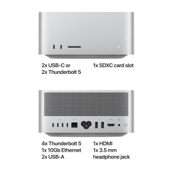 · 連接強而有力:Mac Studio 配備 M4 Max,設有四個 Thunderbolt 5 連接埠、兩個 USB-A 連接埠、一個 HDMI 連接埠、一個 SDXC 卡槽及一個耳筒插口,可連接多達五個外置顯示器。